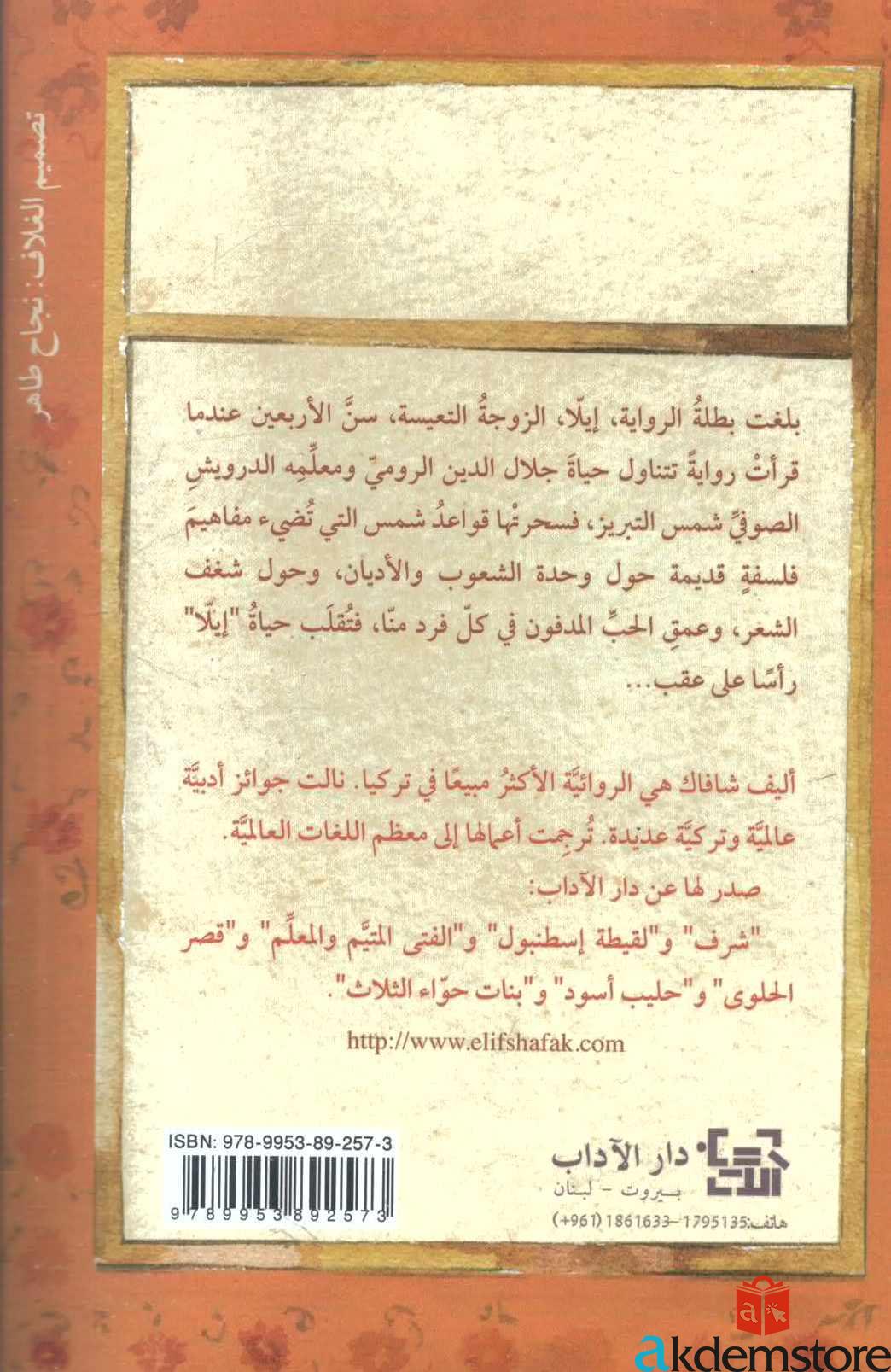 عندما انعطفنا عند ناصية الشارع، واقتربنا من خان تجار السكر، لمحت ولياً تقياً جوالاً يشق طريقه عبر الحشد، يتهادى نحوي مباشرة ويرقعني بعينين ثاقبتين، كانت حركاته حاذقة ومركزة، وكانت تشع منه هالة من القدرة الذاتية. كان حليقاً، لا لحية له، ولا حاجبين، ومع أن وجهه كان مكشوفاً كما ينبغي لوجه أي رجل أن يكون، فإن قسمات وجهه يكتنفها الغموض، لم يكن مظهره هو الذي فتني وجذب إنتباهي. فخلال سنوات كثيرة، رأيت وراويش جوالين من جميع الأنواع يجتازون قونية سعياً وراء الله، ويعرف معظم هؤلاء الدراويش بسلوكهم المشاكس، بأوشامهم البارزة وأقراطهم العديدة، والحلقات في أنوفهم… لذلك عندما وقعت عيناي على هذا الدرويش، لم تكن قشرته الخارجية هي التي أثارت إنتباهي، بل يمكنني القول أن نظرته هي التي فتنتني، كانت عيناه السوداوان تحدّقان بي بنظرة أحدّ من الخنجر.